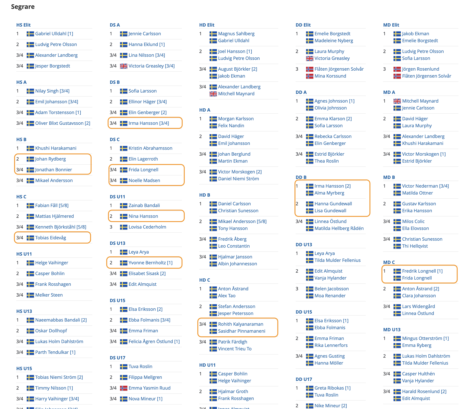 Dessvärre innebar den förlusten att han inte gick vidare från sin pool och Dessvärre innebar den förlusten att han inte gick vidare och istället tar både Jonathan Bonnier och Johan Rydberg sikte på semifinal på söndagen, liksom Tobias Eidevåg som gjorde tävlingscomeback, denna gång i HS C. Det var också ett nöje att se så många från klubben göra comeback efter corona, bland annat Erik Gundewall och Lars Nilsson. Roligt var det också att vi hade två tävlingsdebutanter med som dessutom gjorde strålande ifrån sig ända fram till semifinal i HD C. Bra jobbat, Rohith och Sasi från ST3.